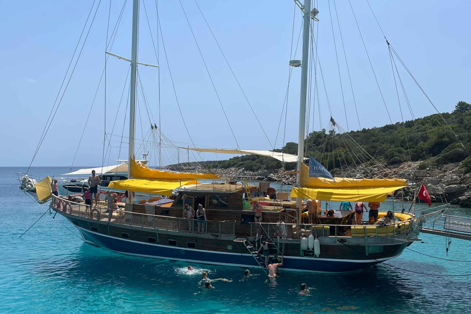 ボドルムのオラク島への船旅に出発し、日光浴を楽しみましょう。港で直接集合するか、ボドルム、グムベット、ビテズ、オルタケント、またはヤシのホテルで迎えてもらうかを決めてください。 船に乗ったら、日光浴に最適な場所を選び、水上からボドルムの景色を眺めましょう。ジャーマン湾の透き通った海に飛び込むか、上のデッキでただリラックスして素晴らしい写真を撮ってください。船上で提供されるおいしい 3 コースのランチをお楽しみください。 次に、オラク島湾に向かいます。ここでは、自分のペースで 2 時間探索できます。白い砂浜をゆっくりと散歩したり、シュノーケリングをしたり、魅力的な海で泳いだりしてください。ボドルムに戻るときは、ラビット ノーズ国立公園に立ち寄って、印象的な灰色の岩と青い海を眺めましょう。 夕食にちょうど間に合うようにボドルム港に戻ります。Includes